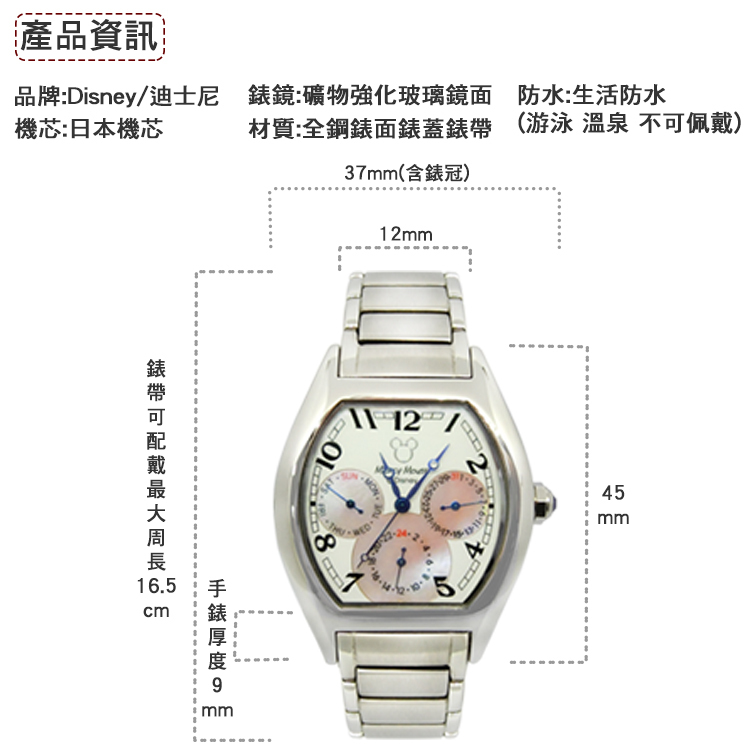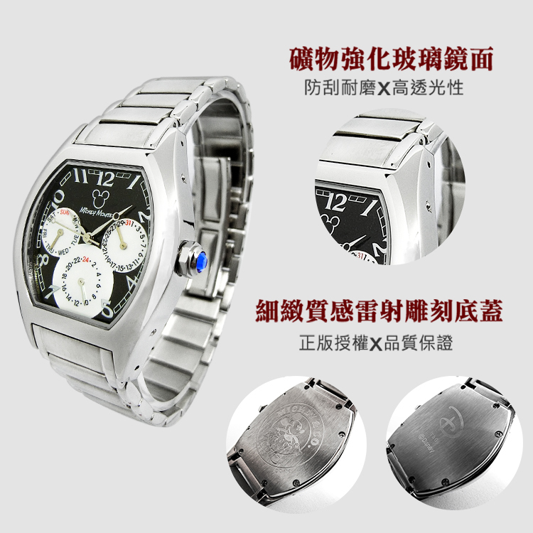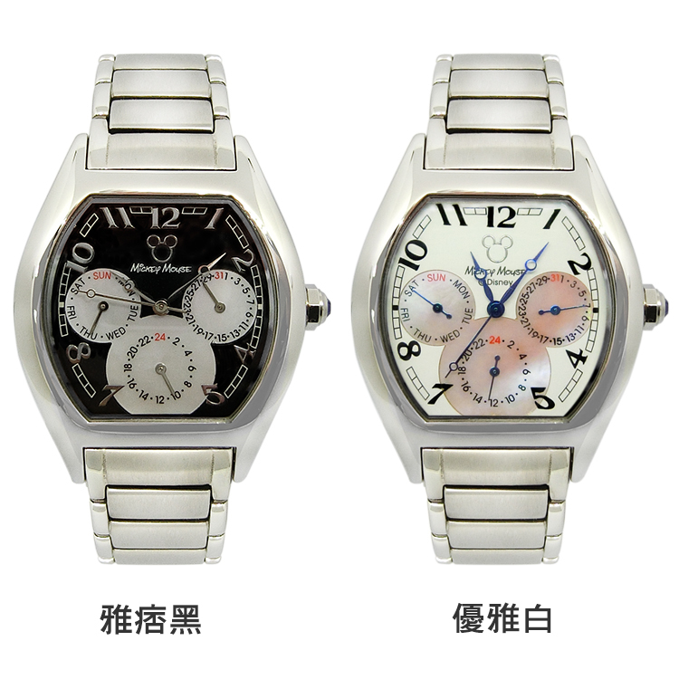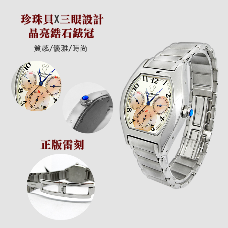 【迪士尼】酒桶型三眼鋼帶錶(白)