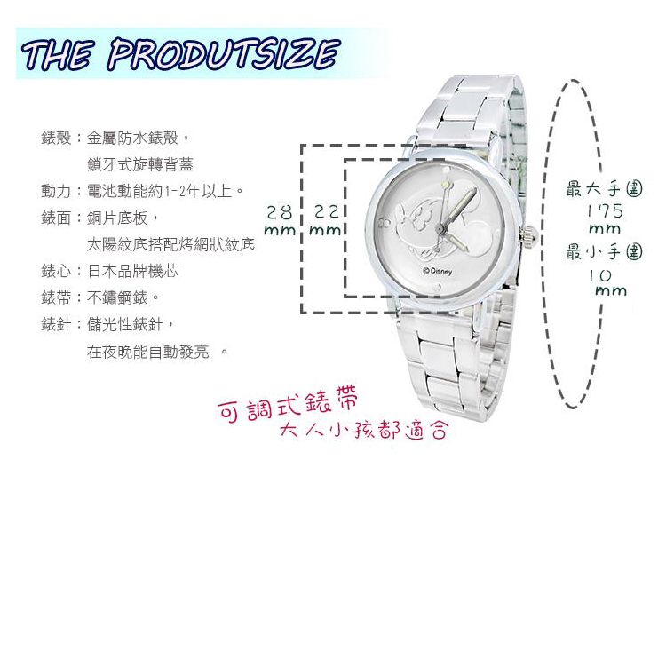 錶殼:金屬防水錶殼,鎖牙式旋轉背蓋,防水性佳。
